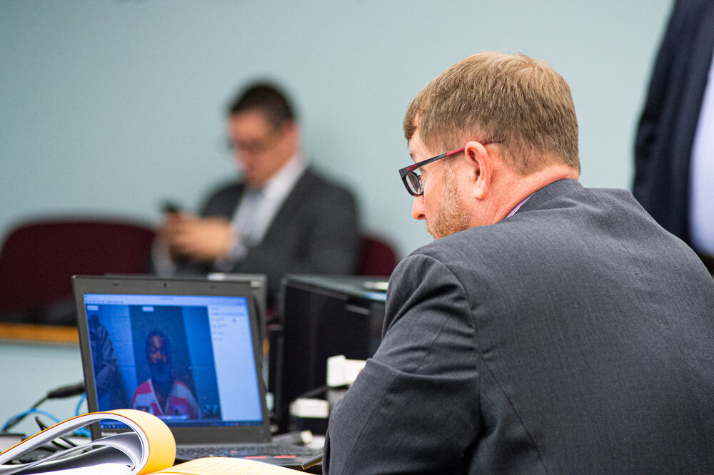 Assistant District Attorney Jason Smith discusses other cases with the judge — the defendants and their attorneys on a live video feed broadcasting from the jail — while the two murder suspects are transported to the courthouse. (Port City Daily photo/Mark Darrough)